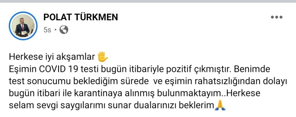 Eşimin COVID 19 testi bugün itibariyle pozitif çıkmıştır. Benimde test sonucumu beklediğim sürede ve eşimin rahatsızlığından dolayı bugün itibari ile karantinaya alınmış bulunmaktayım..Herkese selam sevgi saygılarımı sunar dualarınızı beklerim.”