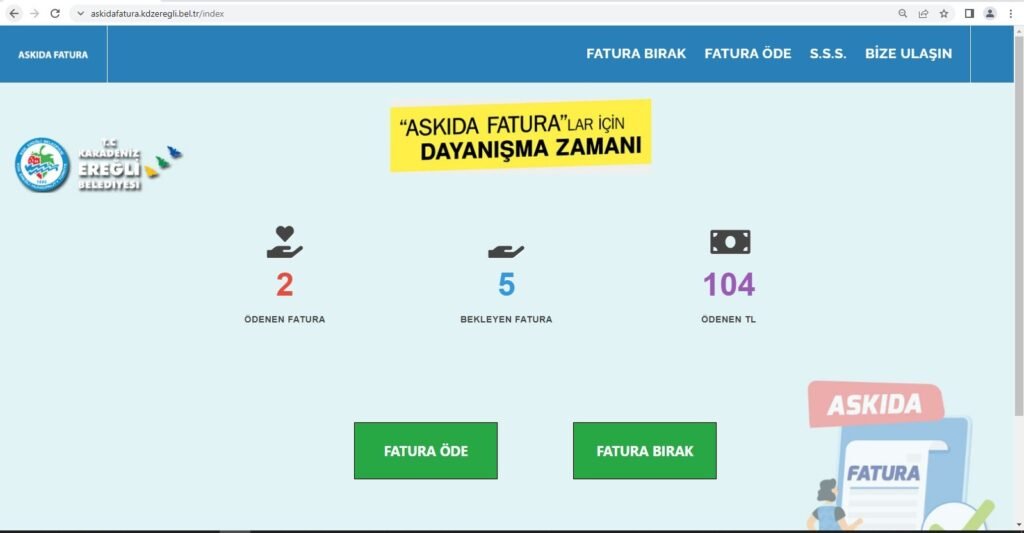 Kdz. Ereğli Belediyesi’nin su faturalarını ödemede güçlük çeken vatandaşlar için düzenlediği ‘Askıda Fatura Uygulaması’ kampanyası yeniden başladı. Faturasını ödeyemeyen vatandaşlar belediyenin askidafatura.kdzeregli.bel.tr adresine ya da bizzat Çözüm Masası’na başvurabilecek, hayırseverler de bu adresten diledikleri faturayı ödeyebilecekler.