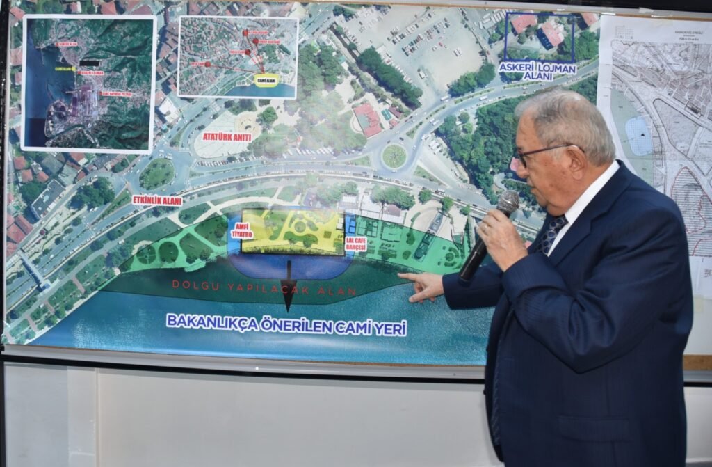 Bakanlıktan bize imar planı geldi. 1 ay içinde onaylayın, yoksa kabul etmiş sayılırsınız diyor. Planda Amfi Tiyatroya camiyi koymuşlar. Yanlarına müştemilat yapacaklar. Aynı zamanda Lal Kafe’nin bahçesini almışlar. Caminin bahçesiyle birlikte 700 metre alanı almışlar, Alemdar Gemisi’nin yarısını da cami bölgesi ilen etmişler. Sarıkamış Deniz Şehitleri ile Sevgi Barış Dostluk Köprüsü arasını cami bölgesi ilan etmişler, kafelerin bahçelerini de almışlar. Camiyi biz buraya yapıyoruz, diyorlar.