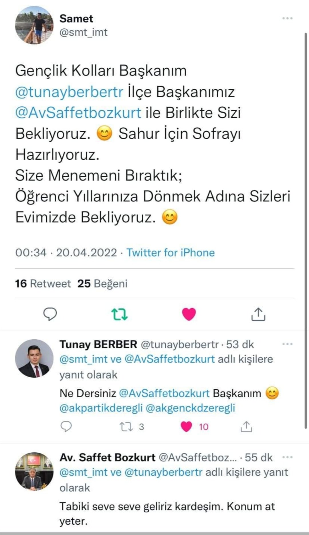 AK Parti Kdz. Ereğli İlçe Başkanı Saffet Bozkurt, İlçe Başkan Yardımcısı Mehmet Yiğitoğlu ve Gençlik Kolları Başkanı Tunay Berber ile birlikte; öğrenci evinde mutfağa geçip öğrencilere kendi elleriyle sahur yemeği yaptı.