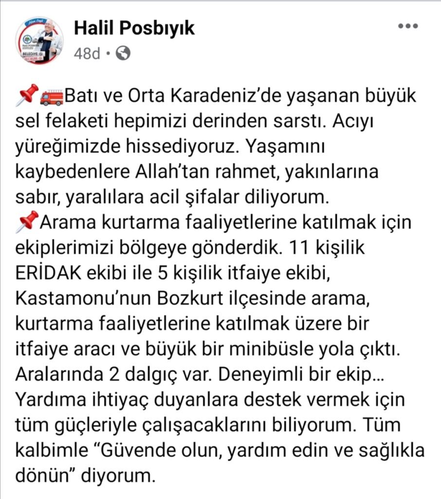 Zonguldak Karadeniz Ereğli Belediye Başkanı Halil Posbıyık, Batı Karadeniz Bölgesi’nde yaşanan afet ile ilgili duyduğu üzüntüyü sosyal medya hesabından paylaştı.