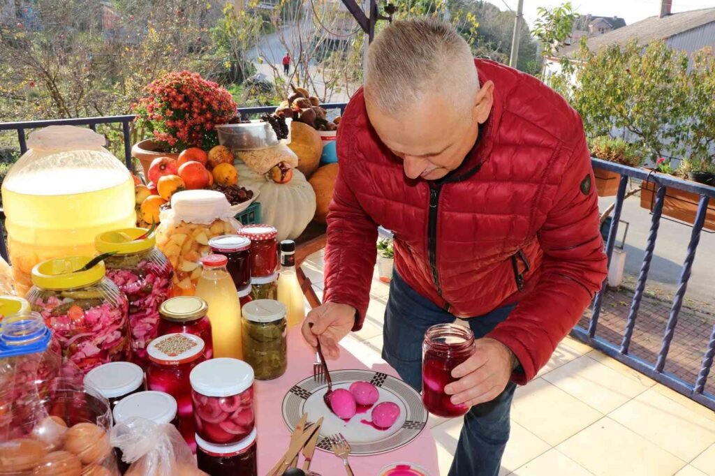 Bahçesinde yüzlerce tavuk, meyve ağaçları, cevizi ve bitkilerinin yanı sıra birbirinden farklı turşular yaparak dikkat çeken Koç ailesi son olarak yumurta turşusu ile ilgi odağı oldu.