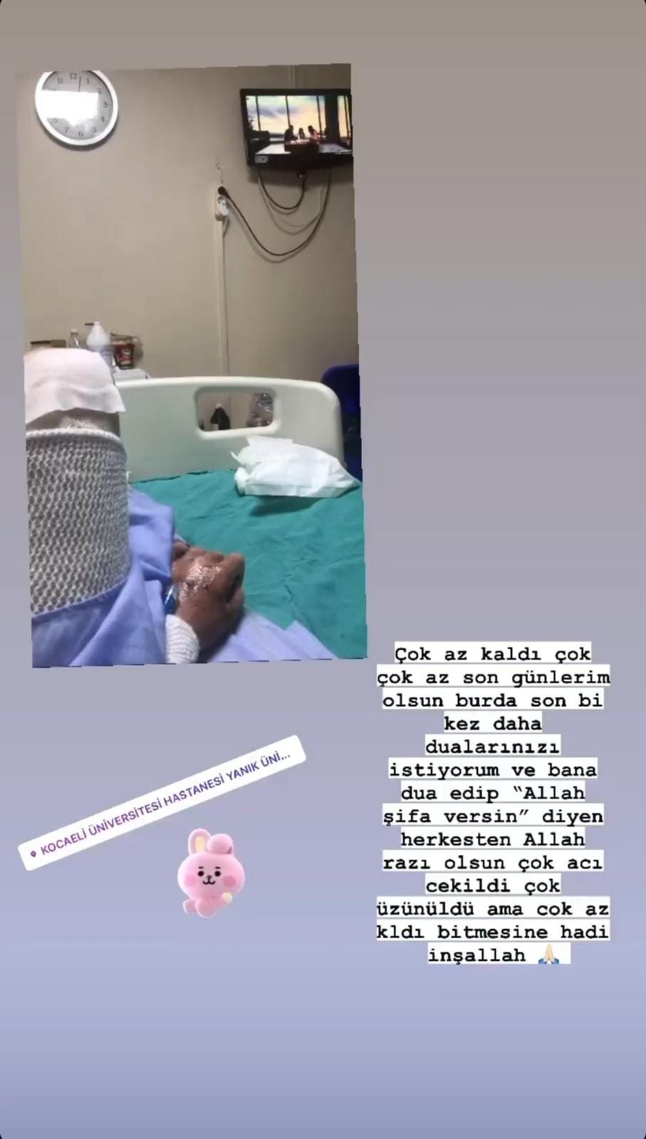 “Çok az kaldı çok, çok az son günlerim, olsun burada son bi kez daha dualarınızı istiyorum. Ve bana dua edip, Allah şifa versin diyen herkesten Allah razı olsun. Çok acı çekildi çok üzünüldü ama çok az kaldı bitmesine hadi inşallah.”