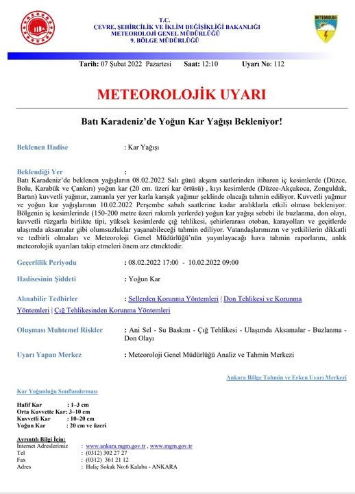 Zonguldak Valiliği yaptığı açıklamada iç kesimlerde kar, kıyı kesimlerde yağmur ve karla karışık yağmur beklendiğini duyurdu.