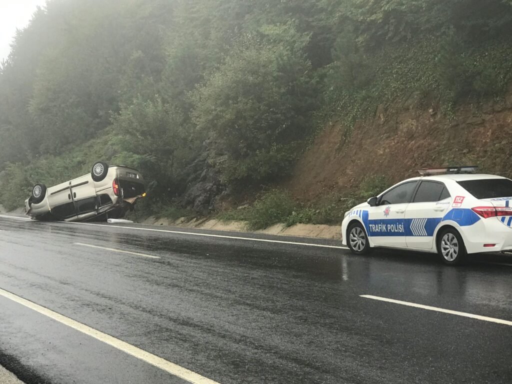 Zonguldak’ın Ereğli ilçesinde yağmur nedeniyle kayganlaşan yolda bir araç takla attı.