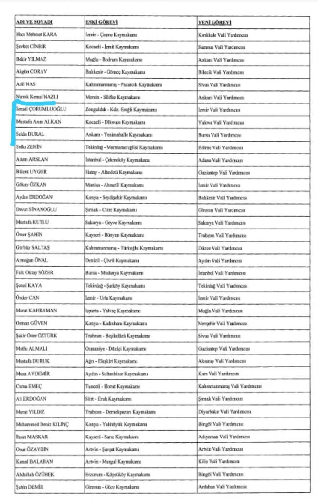 Resmi Gazete’de yayımlanan atama kararnamesi ile 624 mülki idare amirinin görev yeri değişti. Karadeniz Ereğli İlçe Kaymakamı İsmail Çorumluoğlu, İzmir Vali Yardımcılığına atanırken, Trabzon Vali Yardımcısı Mehmet Yapıcı Kdz. Ereğli Kaymakamı olarak atandı.