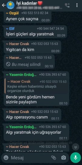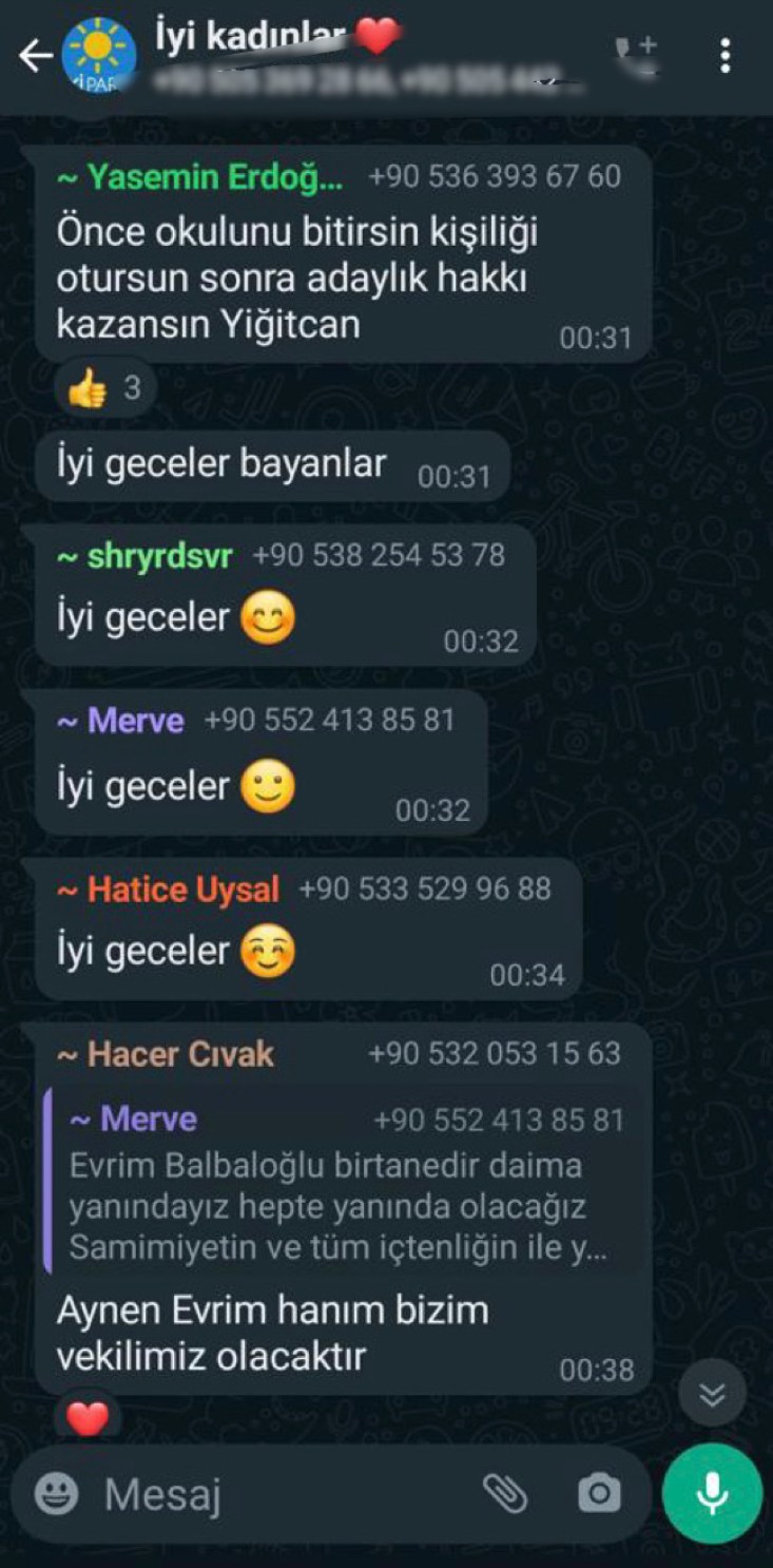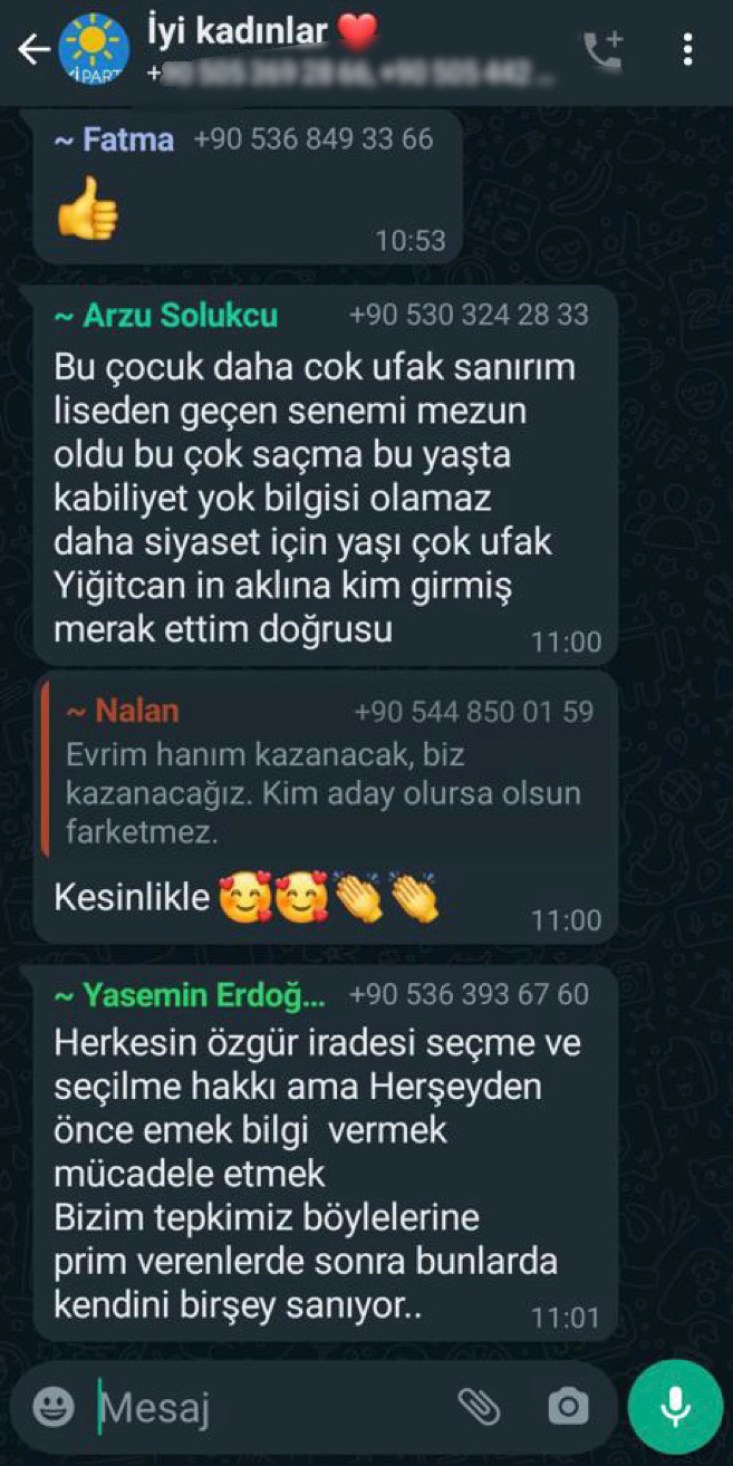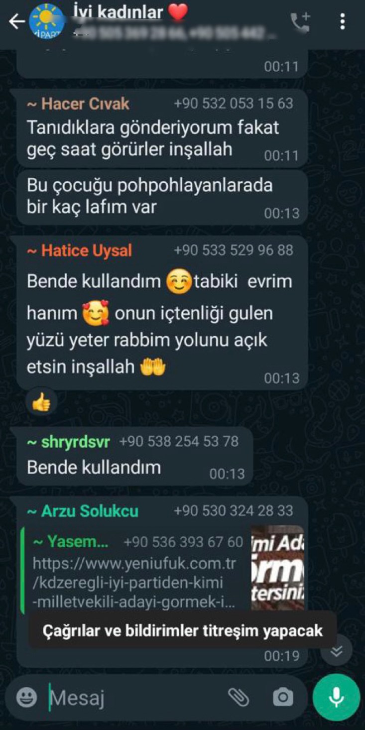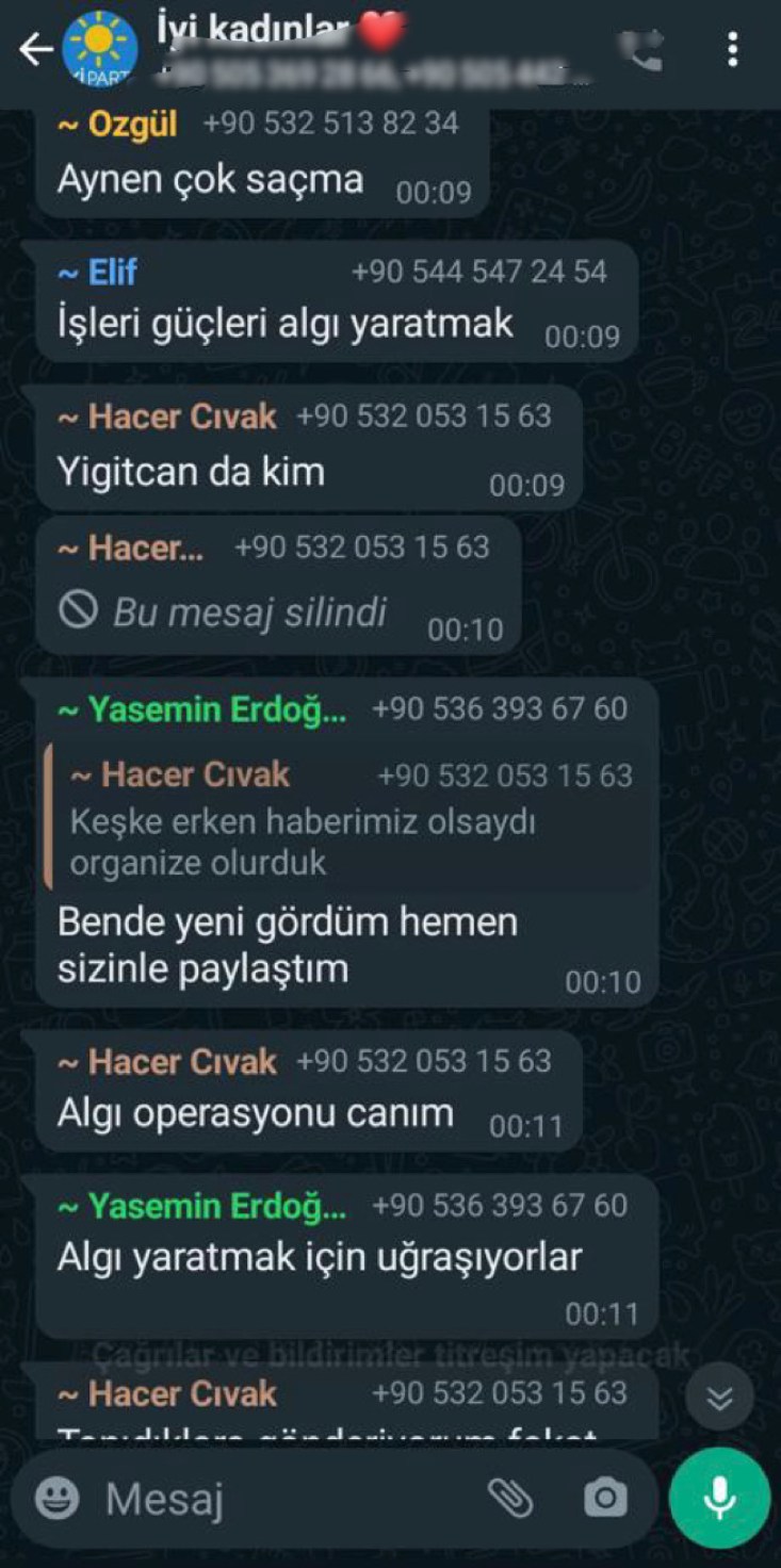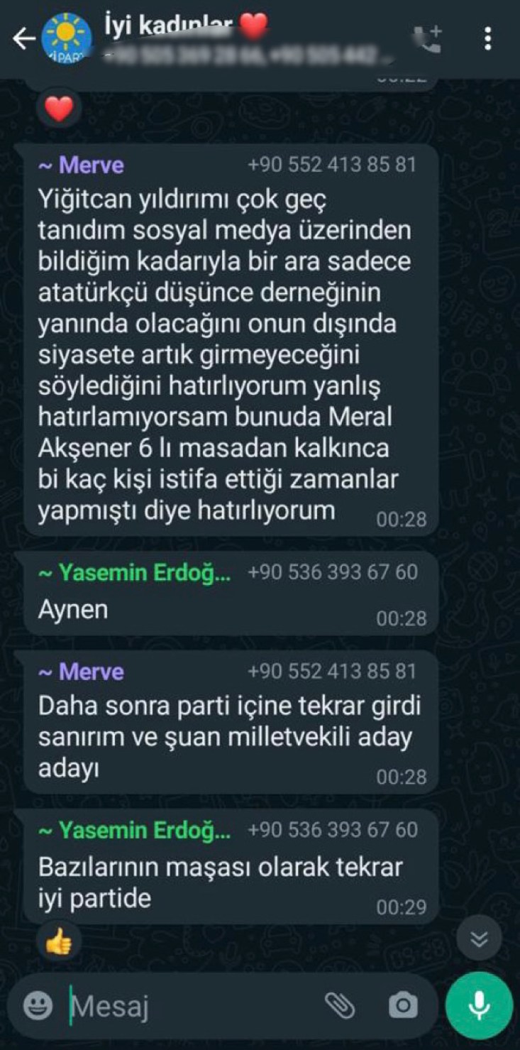 İYİ Parti Kdz.Ereğli İlçe Teşkilatı kadın üyelerinin whatsapp grubunda yazılanlar dudak uçuklattı. İYİ Parti’den Zonguldak Milletvekili aday adayı Yiğitcan Yıldırım’ın Yeni Ufuk’un anketinden lider çıkmasını ‘algı yaratmak’ olarak lanse eden İYİ Parti İlçe Yerel Yönetimler Başkanı Yasemin Erdoğan; kendi partisinin milletvekili aday adayı Yıldırım’ı ‘birilerinin maşası’ olmakla suçladı.