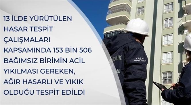 13 İlde 153 Bin 506 Bağımsız Birimin Acil Yıkılması Gereken, Ağır Hasarlı ve Yıkık Olduğu Tespit Edildi