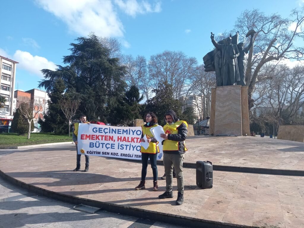 KESK’e bağlı Eğitim-Sen üyesi memurlar, bugün öğle saatlerinde Atatürk Anıtı önünde bir basın açıklaması düzenlediler. Yaklaşık 30 kişilik grubun zaman zaman sloganlar artarak hayat pahalılığına dikkat çektiği eylemde şu ifadelere yer verildi.