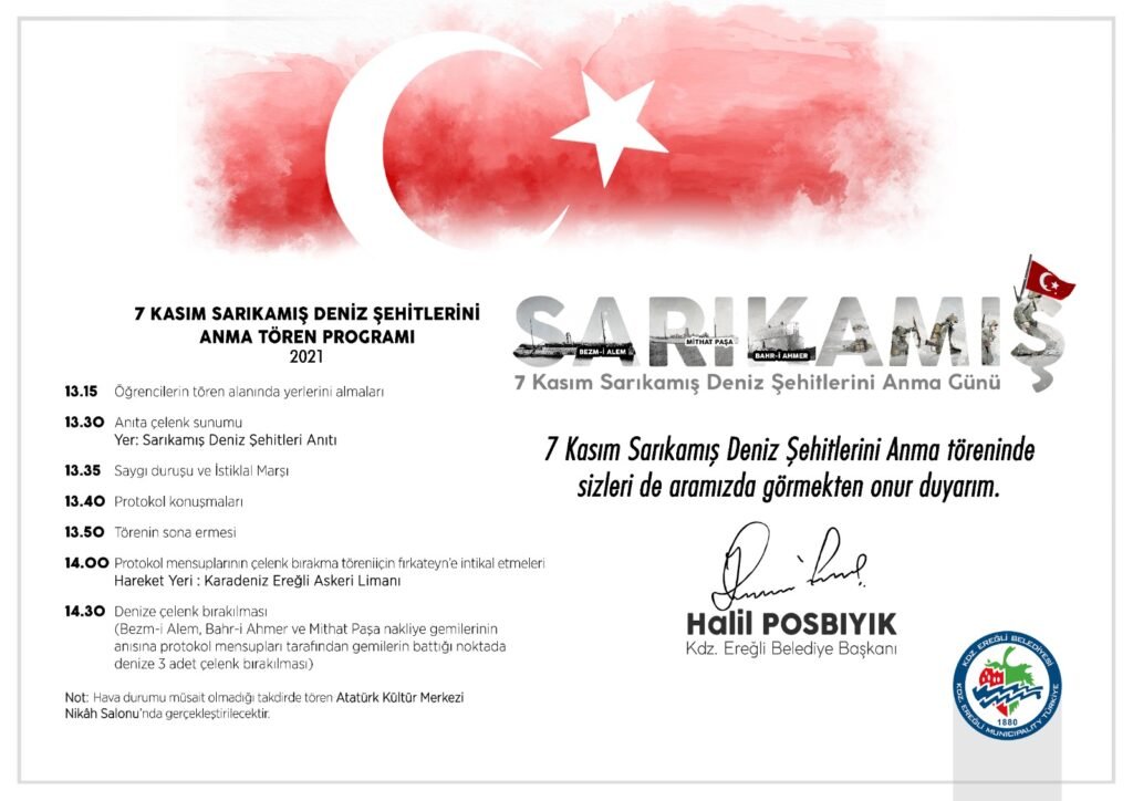 Tarihimizde büyük kahramanlıklarla beraber büyük facialar da yaşanmıştır. Birinci Dünya Savaşı’nda Sarıkamış harekatına destek malzemeleri taşırken Karadeniz Ereğli’de batırılan üç gemi Bezm-i Alem, Bahr-i Ahmer ve Mithat Paşa’yı ve orada şehit düşenleri unutmuyoruz. Sarıkamış harekatında verdiğimiz binlerce şehidimizi rahmetle anıyoruz.