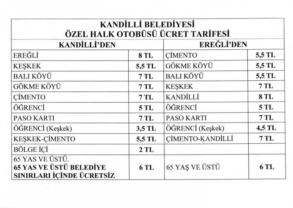 Ereğli ile Kandilli arası yolcu taşımacılığı yapan halk otobüslerine yapılan zam ile birlikte; Kandilli-Kdz.Ereğli arası 8 TL, öğrenci 5 TL, paso kartı bulunan ise 7 lira oldu. Kandilli Belediyesi Özel Halk Otobüsleri’nde 65 yaş ve üstü ise 6 lira, ancak belediye sınırları içerisinde ise ücretsiz.