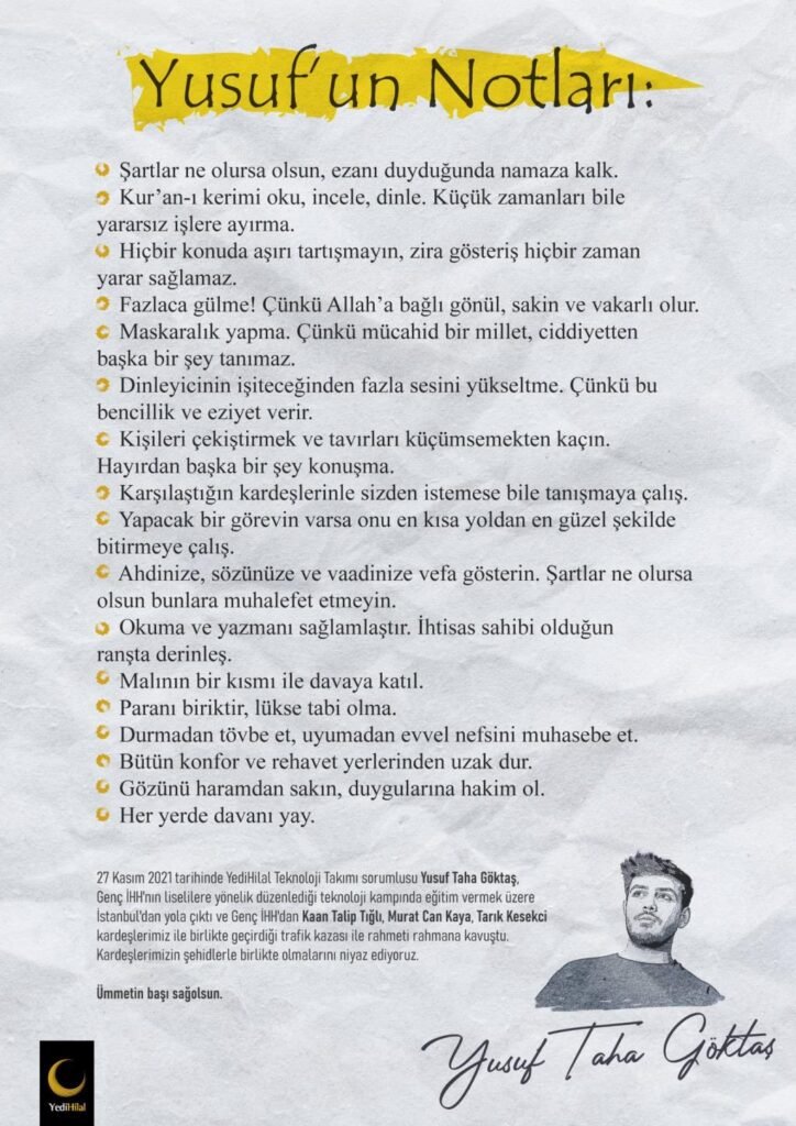 Gebze Teknik Üniversitesi’nde Makine Mühendisliği öğrencisi ve Yedi Hilal Derneği Teknoloji Takımı sorumlusu Yusuf Taha Göktaş, Genç İHH’nın liselilere yönelik düzenlediği teknoloji kampında eğitim vermek üzere İstanbul’dan yola çıktı ve Bursa’da Kaan Talip Tığlı, Murat Can Kaya ve Tarık Kesekci ile birlikte geçirdiği trafik kazası sonrası hayatını kaybetti. Göktaş, geçtiğimiz Pazar günü Kdz. Ereğli ilçesinde dualarla yolculuğuna uğurlandı. Gencin ölümü tüm Türkiye’de büyük yankı bulurken, ölümünden önce duvarına astığı tavsiye notları binlerce genç tarafından #YusufunNotları etiketi ile sosyal medyada paylaşıldı.